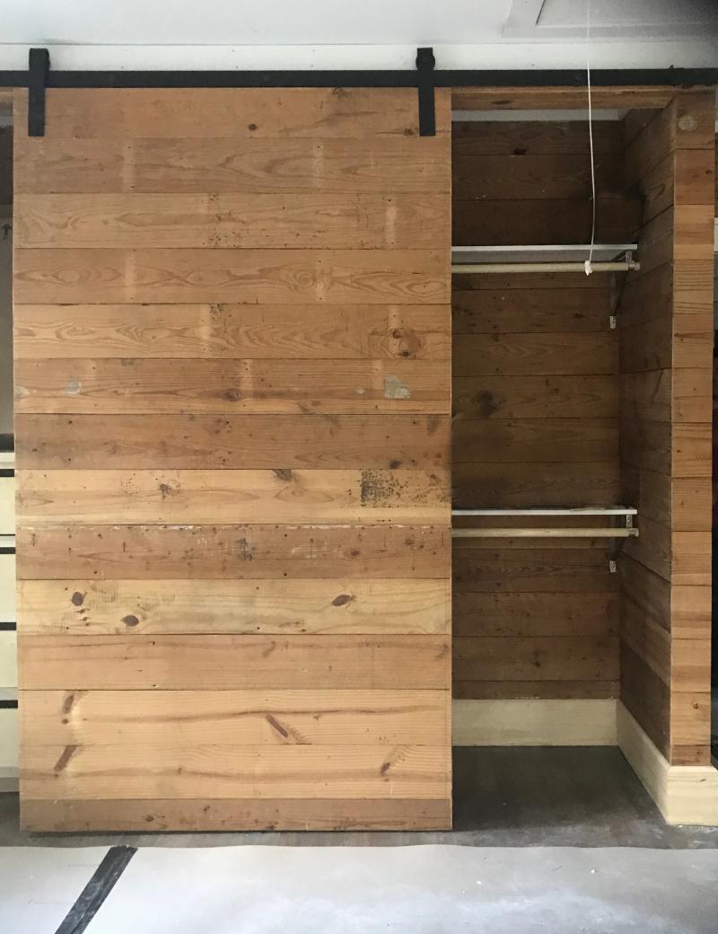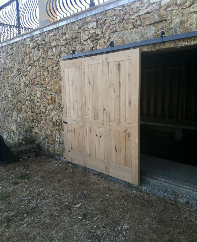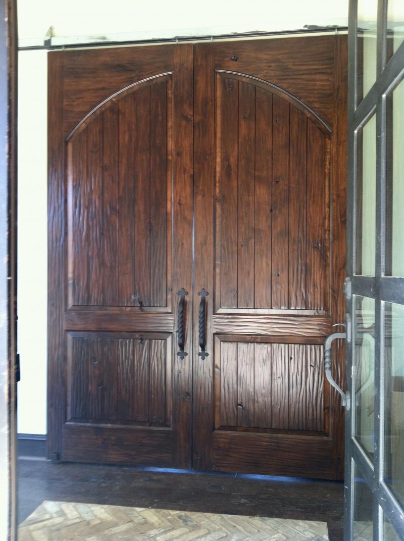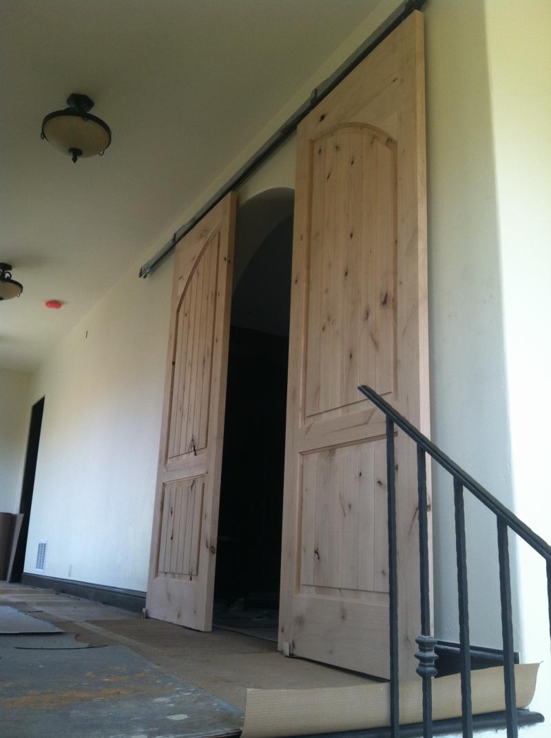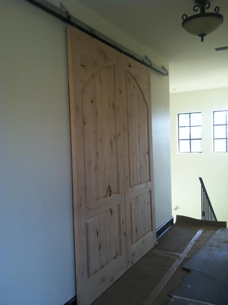 Eyebrow two panel V-groove, double barn door built out of Knotty Alder.