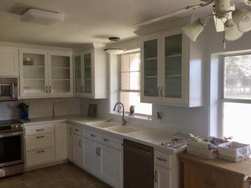 Modern shaker style kitchen with glass upper doors, built out of Maple paint grade.