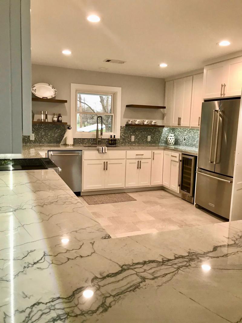 Modern style kitchen with shaker doors & floating shelves, built out of Maple paint grade.