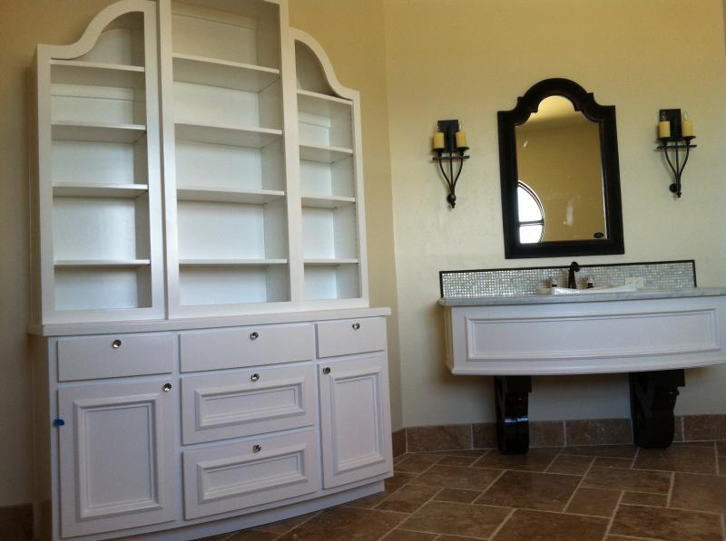 Freestanding custom bathroom vanity topmount sink, with inset doors & drawers.