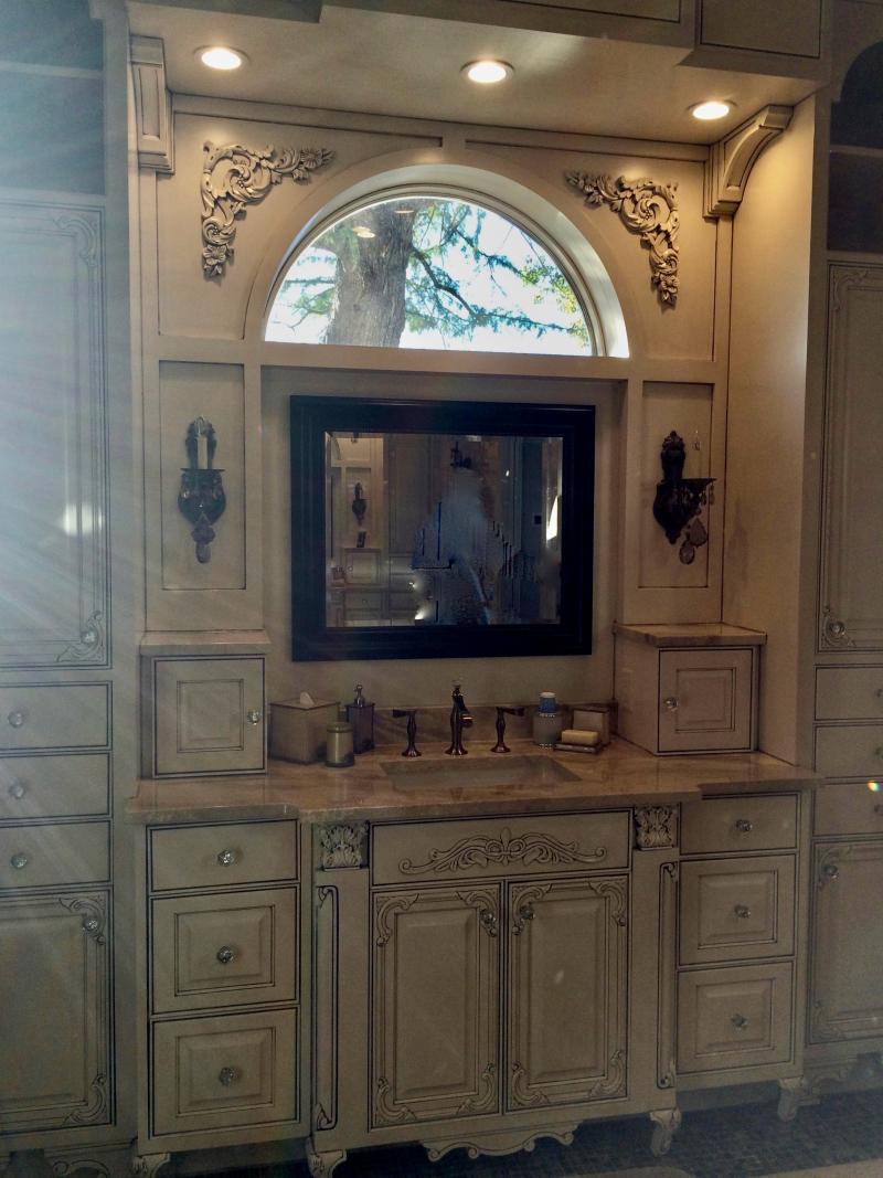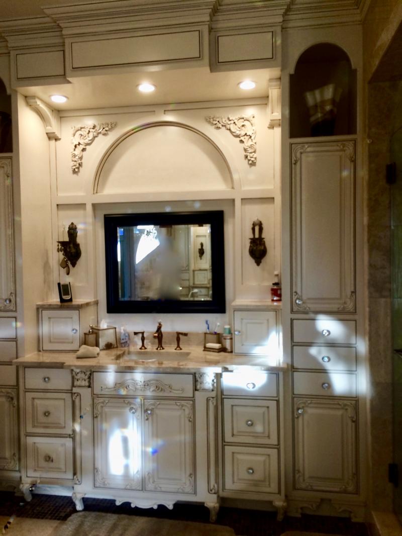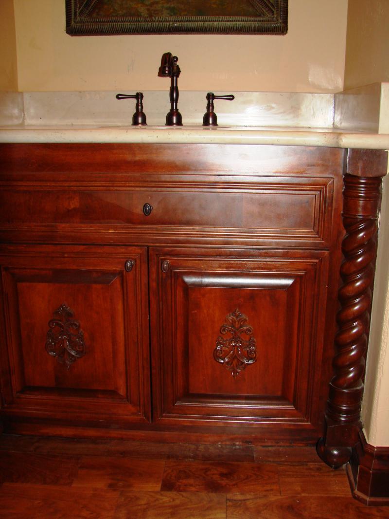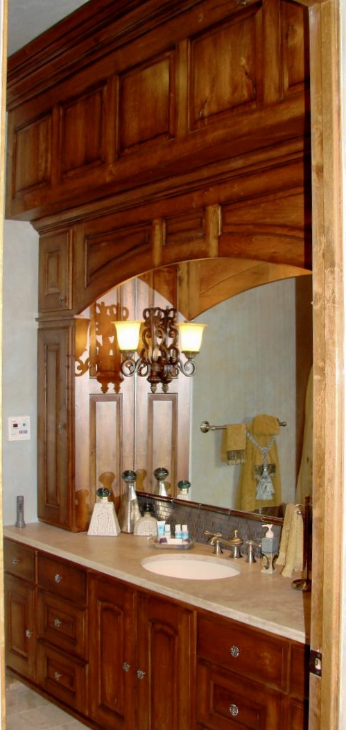Oldworld style bathroom vanity & custom mirror with undermount sink.