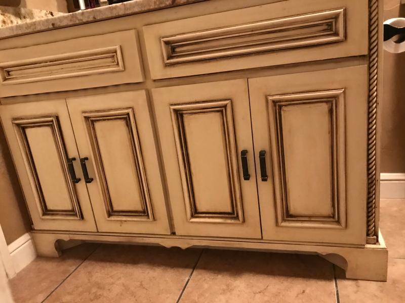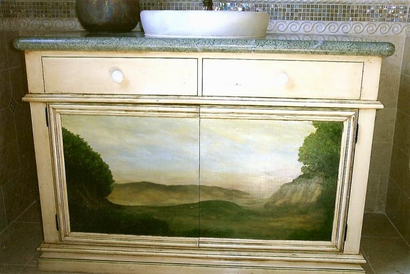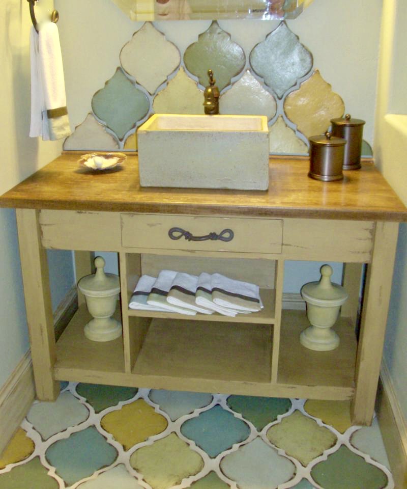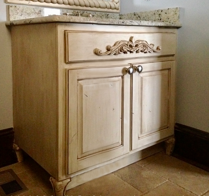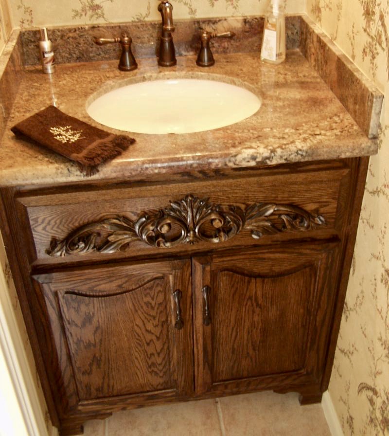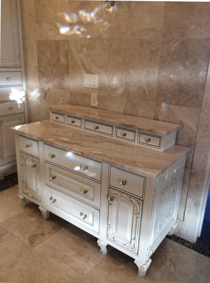 Oldworld style bathroom vanity & custom mirror with undermount sink.