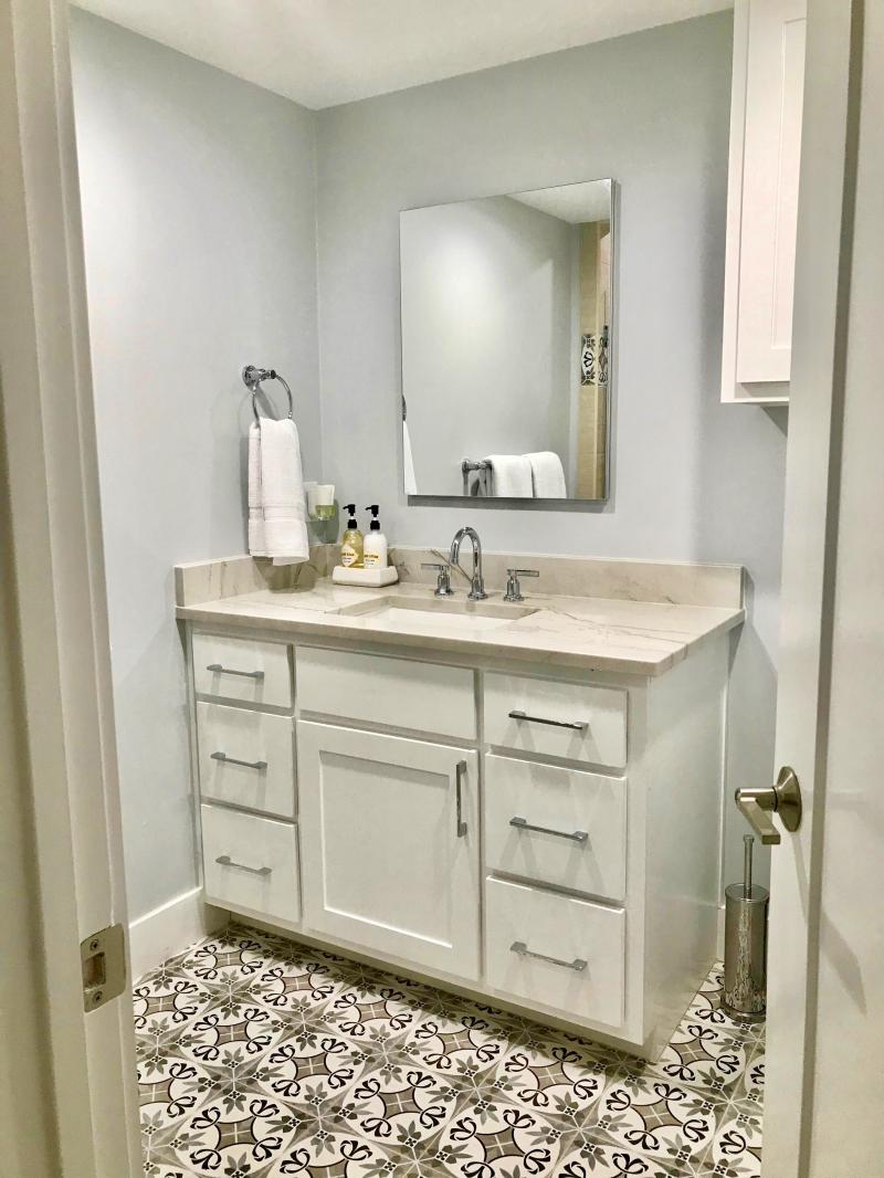 Custom bathroom cabinets & mirror build out of paint grade material.