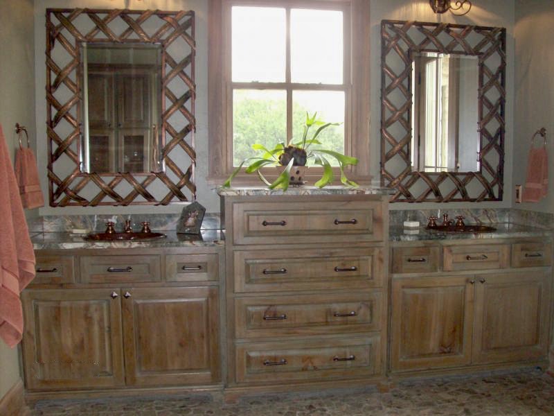 Rustic style double vanity with drawers in the middle, built out of Pecky Cypress.