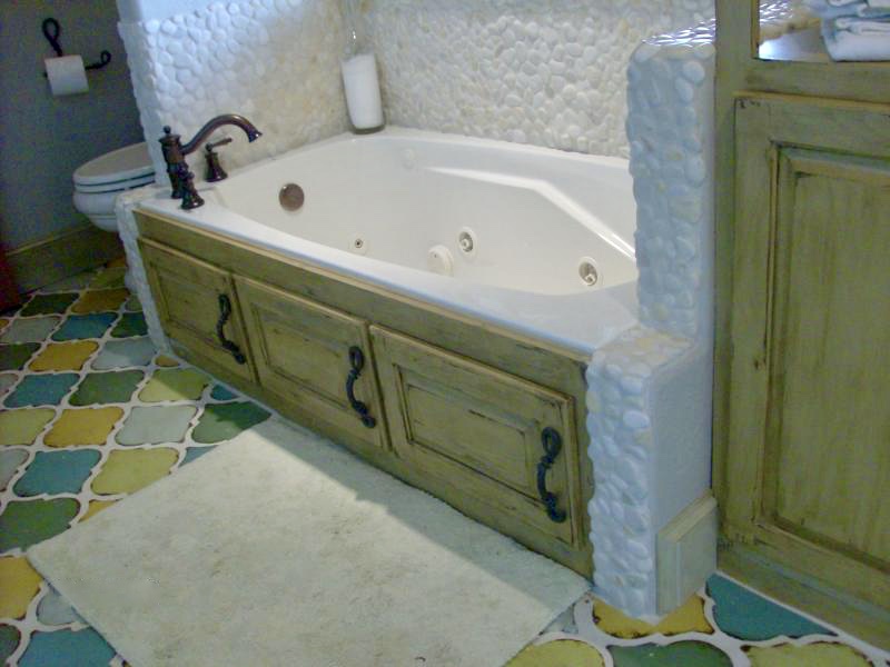 Country style bathtub with wood panels, built out of paint grade.